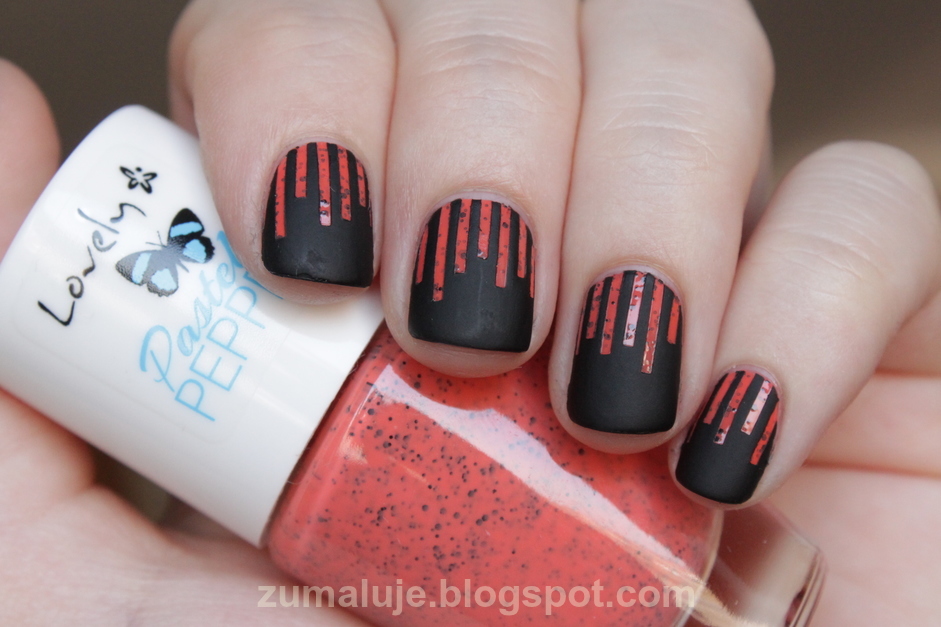 first I painted my nails with red lovely pastel pepper nail polish (and I let it dry really well), then I cut and stick pieces of stripping tape on my nails, quickly painted my nails with 1 coat of black matte my secret polish (chalky matt) and then I removed stripping tape. it's important to act fast and do one finger at the time, because it's the best to remove stripping tape while polish is still wet. and this matte my secret dries really fast! and I have to say it's really great. it's a true matte nail polish. it's really opaque and dries really really fast.