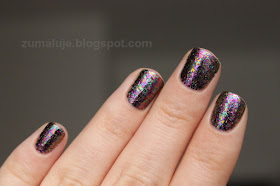 at first I wanted to use kaleidoscope as a topper (while it actually is a topper), but when I finally open it to use it, I decided to apply it with make up sponge. I needed two sponge coats, but I know that you can achieve similar effect applying two coats of flakies on black base. I think it would be wiser, cause when I applied kaleidoscope with sponge on all my nails, there was a large loss in the bottle (you'll have a picture at the end of this post). but I have to say this was the first time that I didn't regret such loss of polish. effect on nails compensated it in 100 % :)