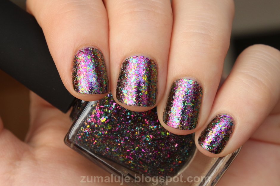 I really like all kind of particles in nail polishes, especially large holo. I'm also a huge fan of many not so liked, unusual colors and some known as pretty/uggly shades (these you either love or absolutely hate. I'm almost always in the first group ;) ) these are all kind of weird green, beige, gold and brown shades and pyrite kind of fits there. it's exactly the mix of gold and brown, but actually name of this polish is just perfect, because base color looks exactly like this mineral. you can also find there my favourite large holo particles, which look absolutely great with this metallic pyrite base.